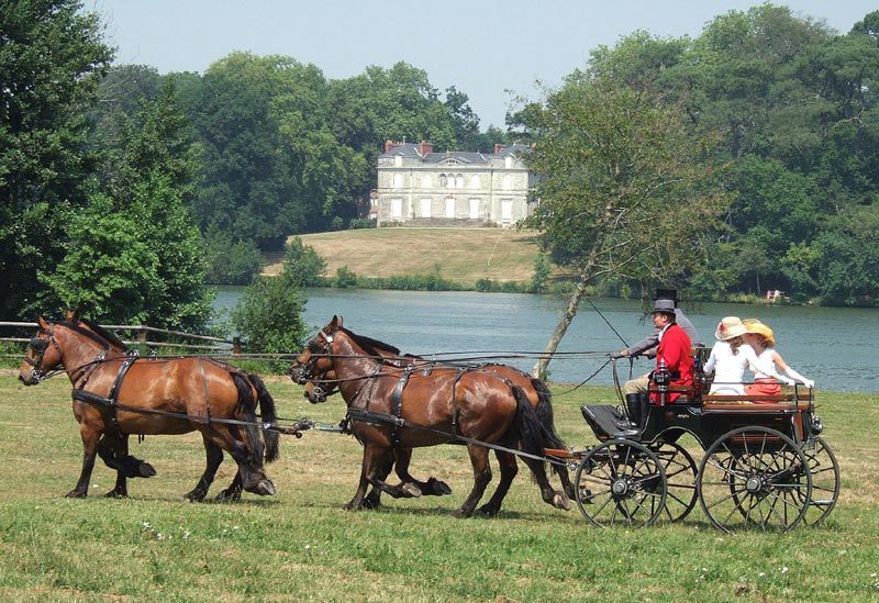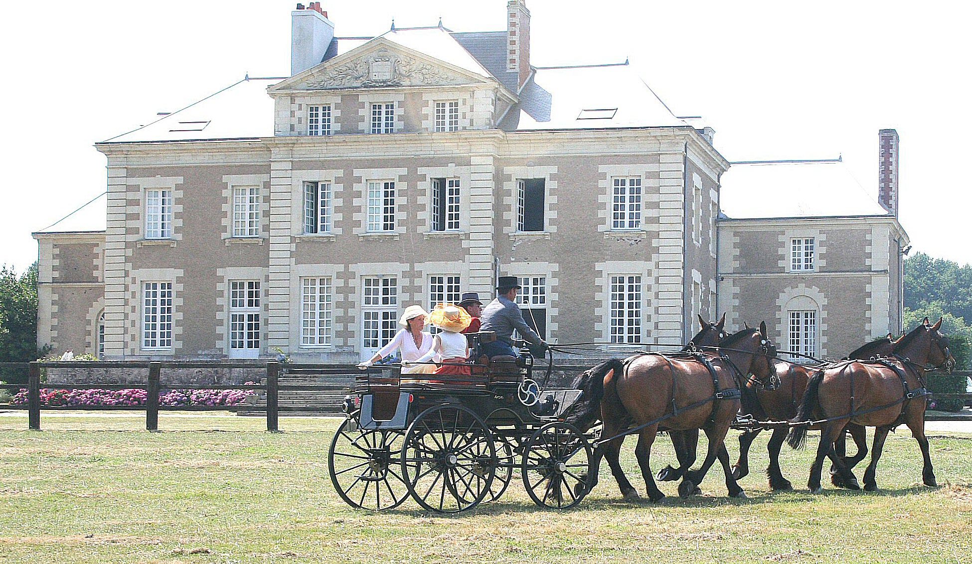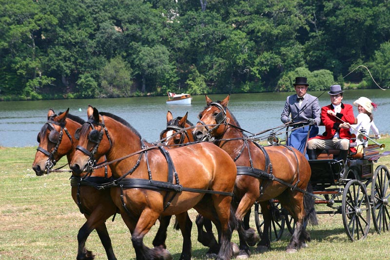 | Revenons à notre attelage d’aujourd’hui. Ce sont 4 magnifiques cobs âgés de 4 à 7 ans et de robe baie. Ils sont tous « hongres » et ont été élevés chez notre neveu, à quelques kilomètres d’ici, sur la rive sud de la Loire. « Joli cœur » et « Krac » sont à la volée, « Labdakos » et « Loustic » sont en retrait, attelés au timon. Les chevaux de race cob présentaient de bonnes aptitudes pour la chasse et l’attelage, en raison de leur calme et de leur grande résistance à l’effort pour les longues chevauchées et les grandes randonnées. | |