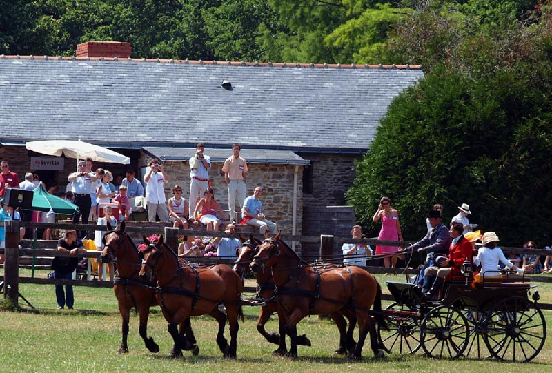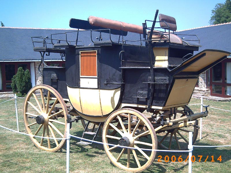 | Saluons « Donatien » en tenue d’équipage de Paimpont, assis aux côtés du meneur, accompagné de deux jeunes élégantes qui ont pris place à l’arrière de la voiture. Mais avez-vous poussé la curiosité de visiter le coin des écuries où est exposé un « mail-coach ». Remercions nos amis Savelli de nous l’avoir aimablement prêté. Il est en fait le coach d’origine de Julien Poydras de la Lande, l’excellent ami de Donatien et Rogatien, et qui habite à deux pas d’ici, à La Gascherie, sur les bords de l’Erdre. | |